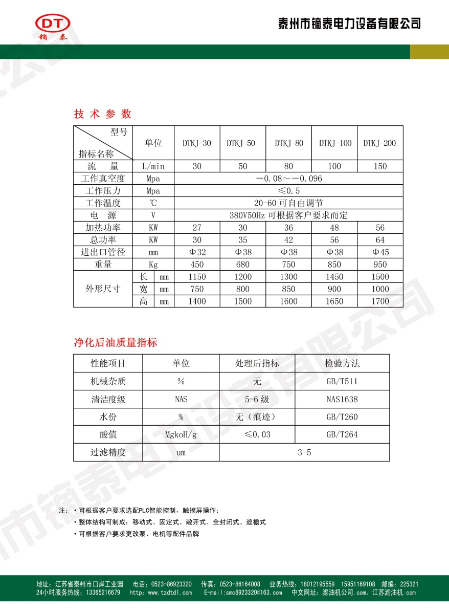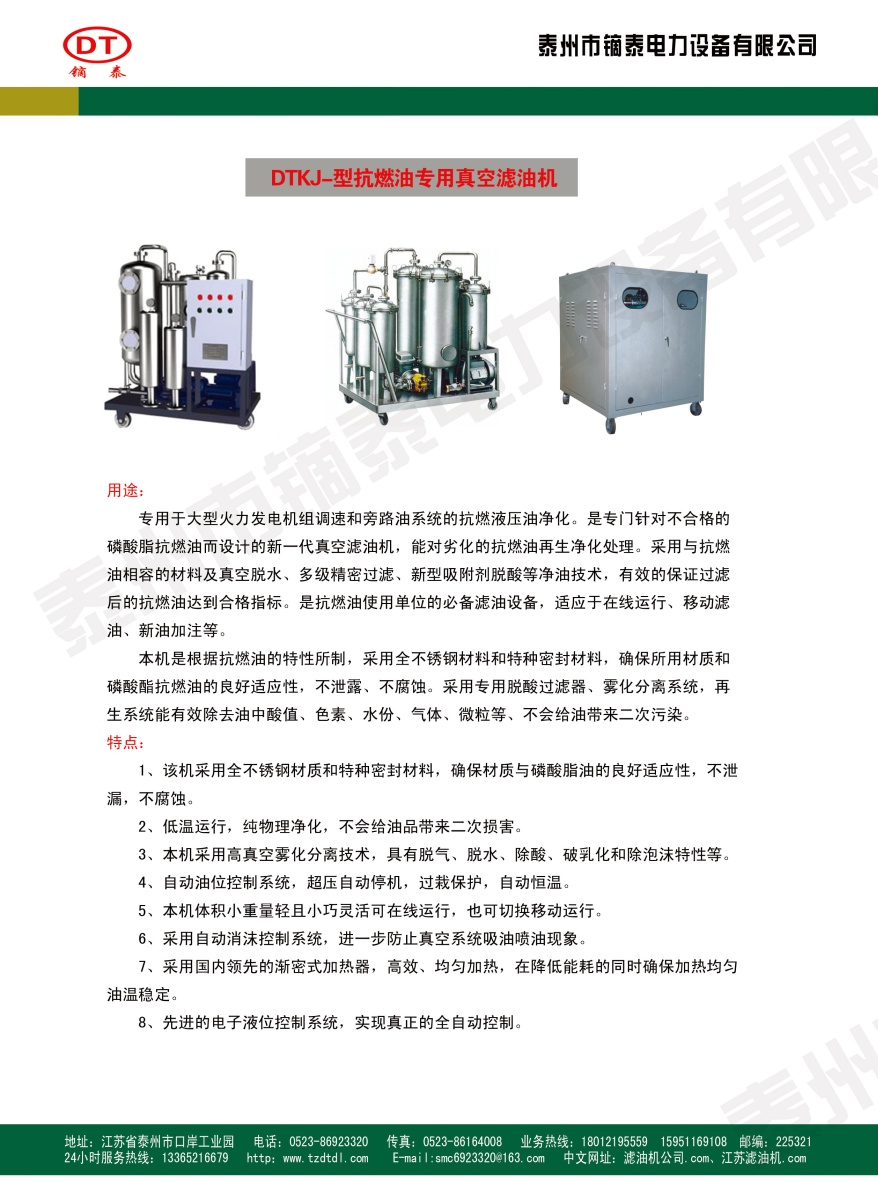 本公司技术力量雄厚,管理体系完善,拥有精良的机械加工设备,测试手段齐全,制造能力强,拥有从事滤油机制造水处理设备十多年工作经验的设计管理人才,被评为“重合同守信用企业”,通过ISO9001:2015、ISO14001:2015、ISO45001:2018认证,主要产品有DTLJ节能系列真空滤油机,DTYJ节能系列透平油专用真空滤油机、DTKJ系列抗燃油专用真空滤油机,DTJJ节能系列板框轻便滤油机、DT系列滤油车,栈桥冲洗器、工程车辆洗轮机、袋式除尘器系列、稀油站系列、闸门启闭机系列、DJYG型集油管、DSJB型双曲面搅拌机、搅拌槽系列、DDJB系列电动搅拌机、立式倒伞型表面曝气机、刮、排泥机械中心驱动装置,填料系列,曝气器系列、减速机系列、高真空滤油机配套的YCB型圆弧齿轮泵,排油泵、真空泵等。DTLC系列双单层滤油磁棒;系列电加热器、干燥箱,DZJYJ系列真空加油机、真空机组、系列油管快速接头、各种规格滤油纸、滤油机专用滤芯、特制PVC钢丝增强抗静电防寒油管、多种规格的检修工具及备品、配件等。
