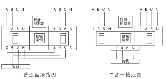 如断路器为3极时,必须将零线接到转换开关的零线端子上(6.2图中常用零线与备用零线分别接到2#及4#接线端子上)。