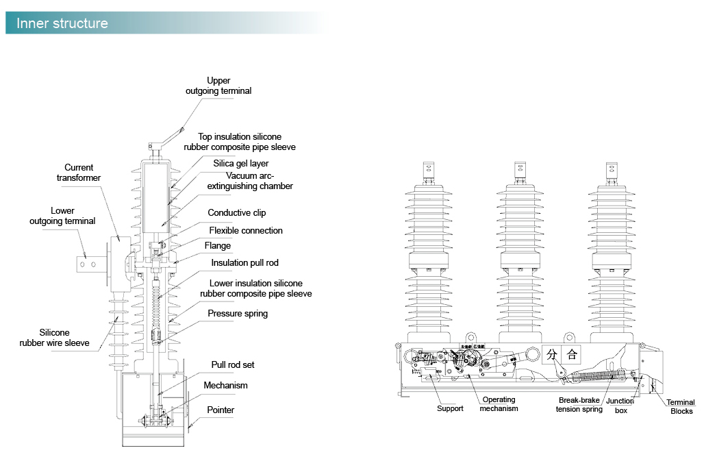 电路重合器的整体结构包括导电电路、绝缘系统、箱体、作机构和密封件。整个导电电路由输入和输出线端子、真空电弧灭火室、导电夹、软连接开通和复合法兰组成。该产品为三相独立垂直柱结构,外层绝缘套由硅橡胶绝缘材料制成。这种结构不仅保证了产品的良好外部绝缘,还改善了相与相、相与地之间的绝缘距离。
