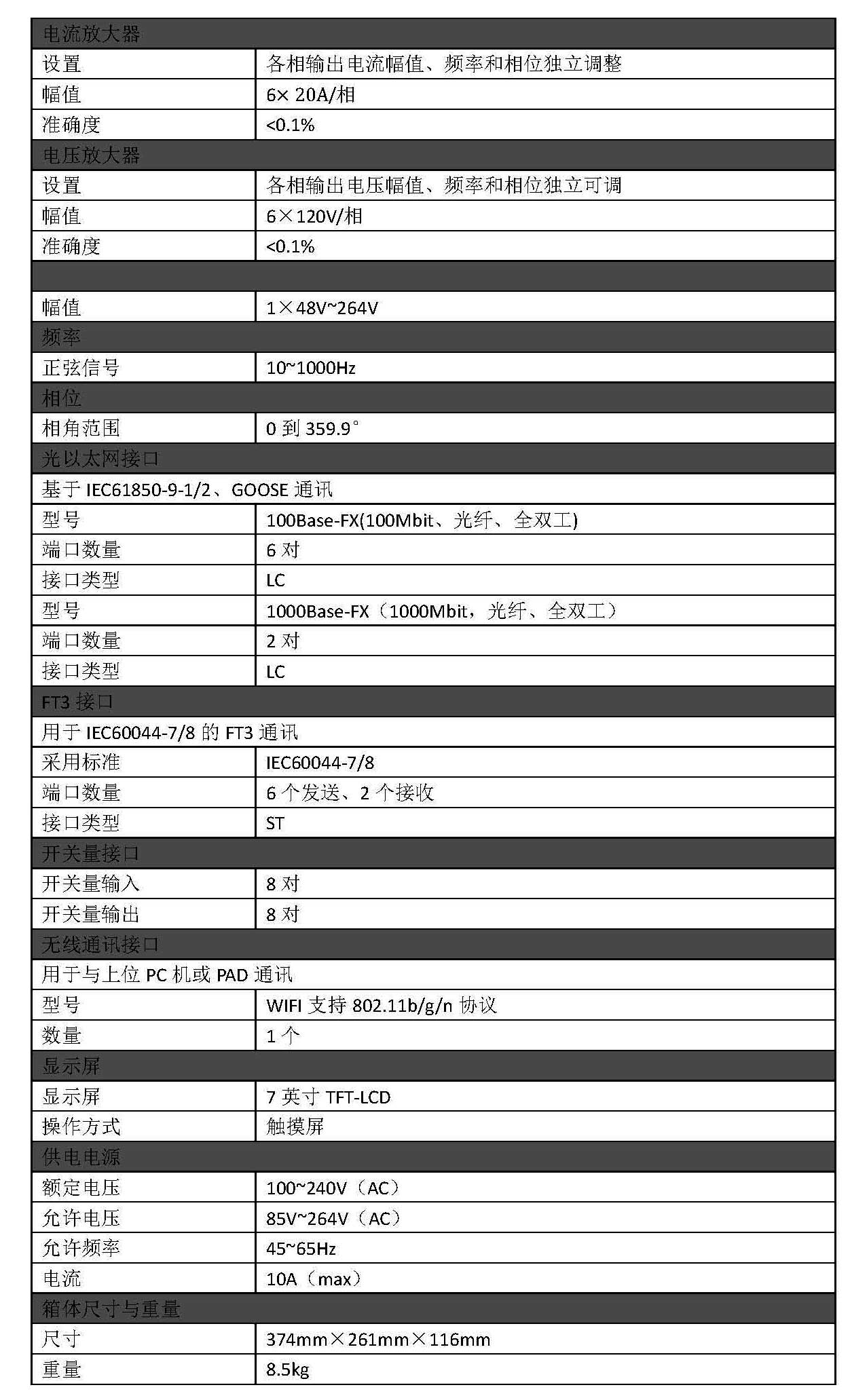 3、支持6电压6电流模拟量输出和数字量输出(SV、FT3和GOOSE收发)接口,不仅可对传统变电站进行测试,还可对数字变电站进行测试