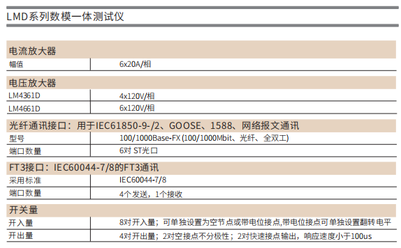 LMD系列数模⼀体测试仪完美结合数字继电保护测试仪和常规继电保护测试仪的功能特点,具有稳定的模拟量输出精度和⾼速数字信号处理能⼒,可满⾜智能变电站或常规变电站的各种测试需求。模拟量及数字量真正意义的同步输出,适应智能变电站新的测试要求。测试软件沿⽤博电继电保护测试仪软件的界⾯⻛格,便于试验⼈员操作使⽤。多应用于智能变电站基建测试、运维检修测试、设备出厂测试或电科院科研单位实验室测试。