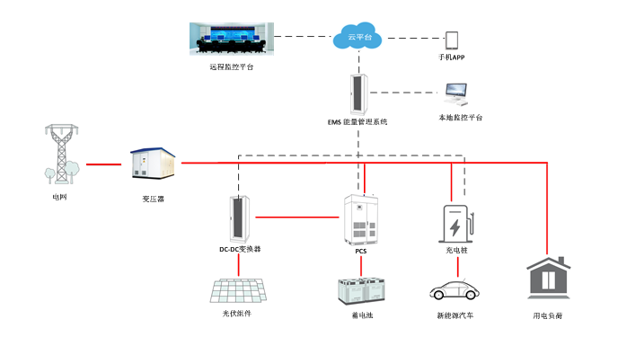 系统中,光伏组件输出的直流电通过DC-DC变换器与蓄电池形成直流母线,共同接入PCS的直流端。PCS的交流端与充电桩和用户其他负荷共同接入电网,形成交流母线。同时通过EMS控制整个系统的工作模式,并可实现现场和工作模式灵活,可以实现光伏-储能-负荷智能化匹配和平衡,实现利益和功能双收益。