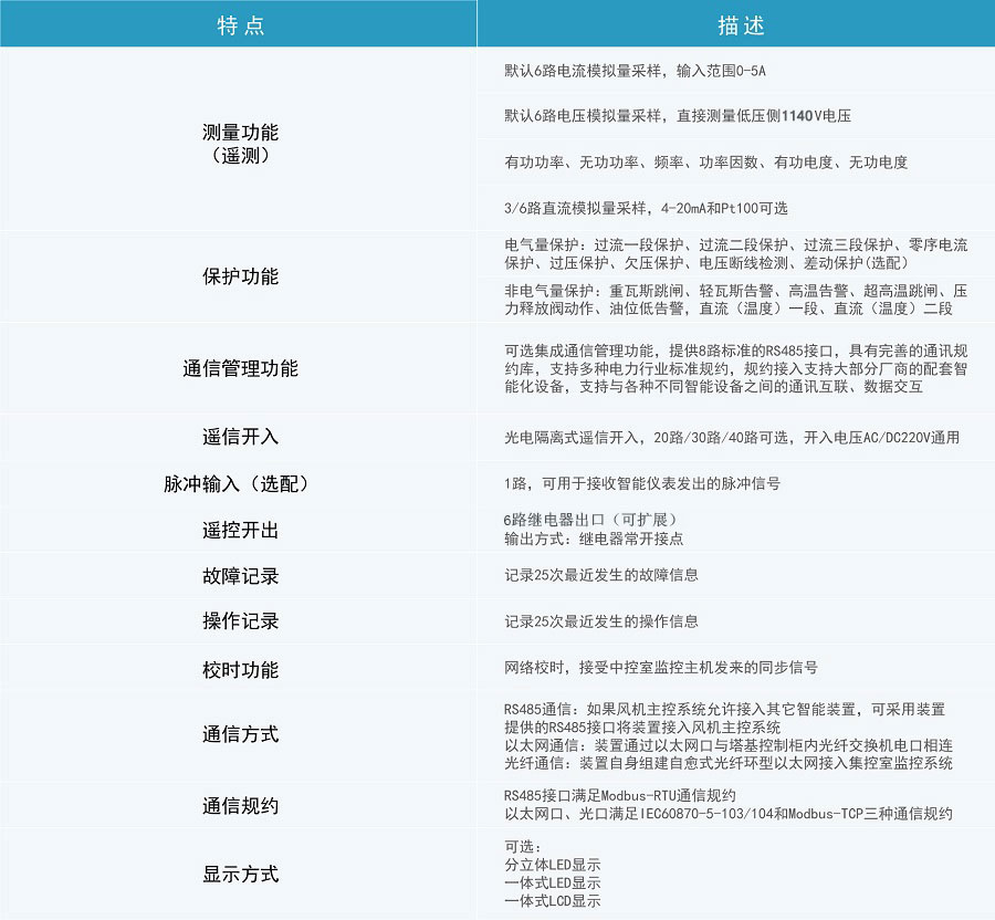 DXDL-XBCK 系列箱变智能监控装置具有“遥测、遥信、遥控、遥调”功能,主要解决风电就地升压变压器安全稳定运行的问题,产品实现了对变压器高、低压侧全部信息的监测,具备非电气量保护、电气量保护以及控制和通讯功能,并实时将采集量上传至综合自动化系统。