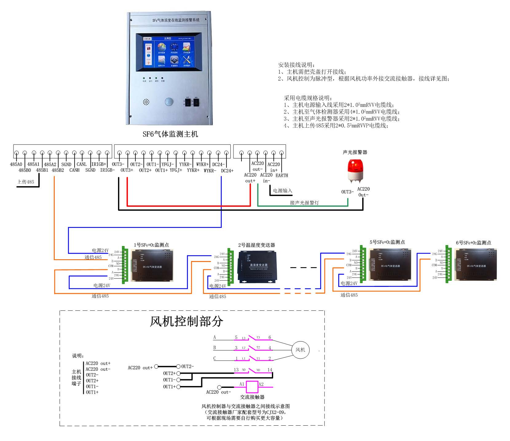SF6气体浓度在线监测报警系统(以下简称本系统),是根据当前电力系统强调安全生产的形势,为在安装有SF6设备的配电装置室的工作人员提供人身健康安全保护而量身设计、开发的智能型在线监测系统。系统图如下