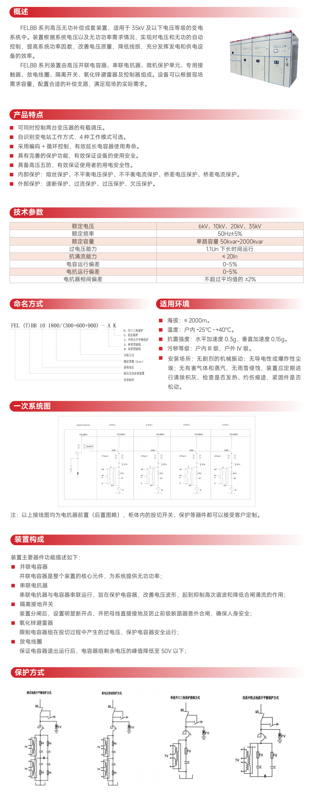 FELBB 系列高压无功补偿成套装置,适用于 35kV 及以下电压等级的变电系统中。装置根据系统电压以及无功功率需求情况,实现对电压和无功的自动控制,提高系统功率因数,改善电压质量,降低线损,充分发挥发电和供电设备的效率。