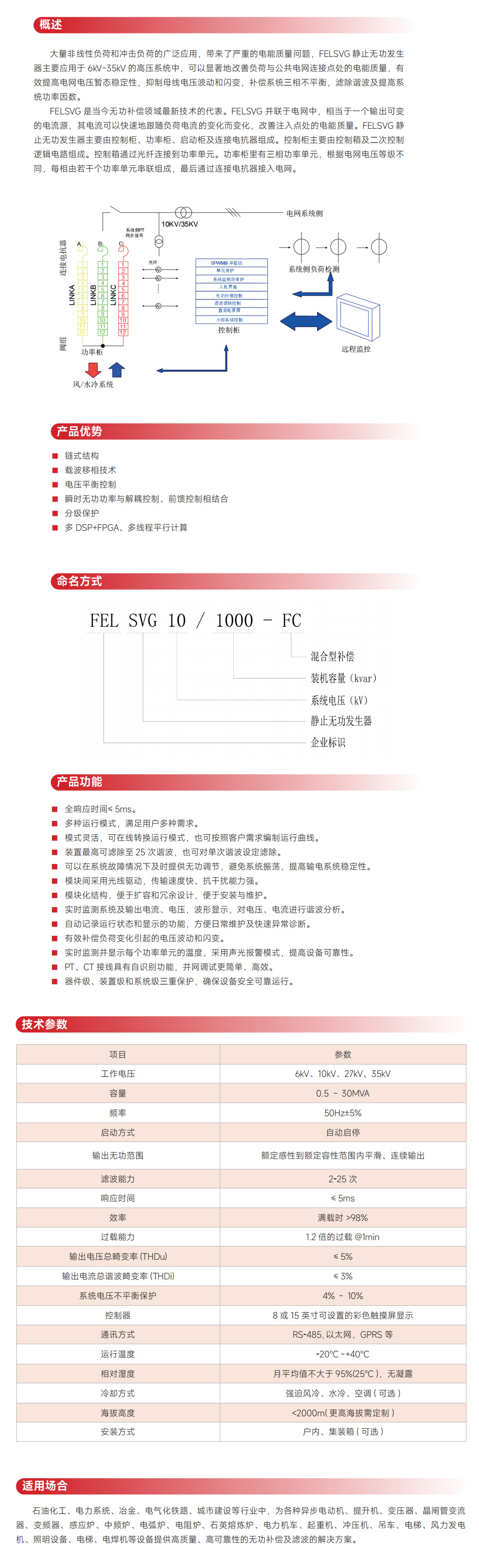 大量非线性负荷和冲击负荷的广泛应用,带来了严重的电能质量问题,FELSVG 静止无功发生器主要应用于 6kV~35kV 的高压系统中,可以显著地改善负荷与公共电网连接点处的电能质量,有效提高电网电压暂态稳定性,抑制母线电压波动和闪变,补偿系统三相不平衡,滤除谐波及提高系统功率因数。