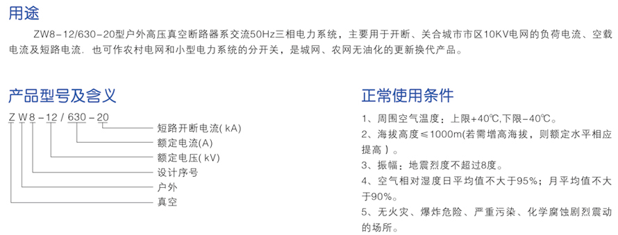 ZW8-12/630-20户外高压真空断路器采用真空灭弧窒,空气绝缘,配以电动弹簧操作机构,使得产品灭弧能力强,短路开断次数高,无火灾爆炸危险,操作方便是一种性能优良,实用性较强的产品。