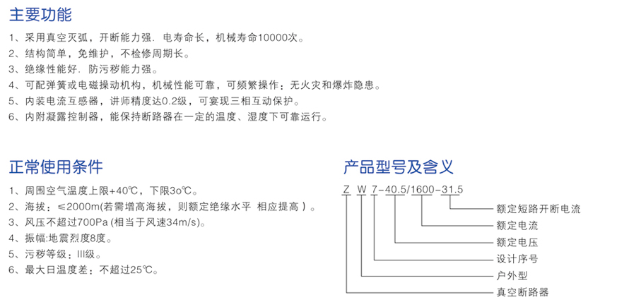 该断路器系三相交流50Hz户外高压开关设备,主要用于农网和城网的12kV系统,作为分、台负荷电流、过载电流及短路电流之用。也可用于其它类似场所。